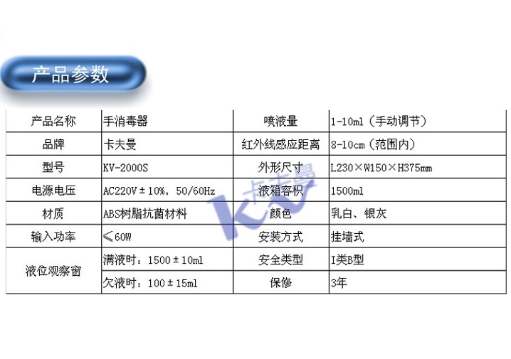 KV-2000S酒精消毒器,采用ABS工程塑料材質。紅外線自動感應,伸手即噴水霧狀消毒液,紅外線感應靈敏,8cm以內距離確保啟動,非觸摸式開關,可防止交叉感染。
